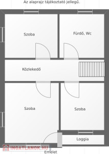 Az emeletre érve 3 külön bejáratú hálószobát, fürdőszobát, és közlekedőt találunk, valamint egy loggiát.